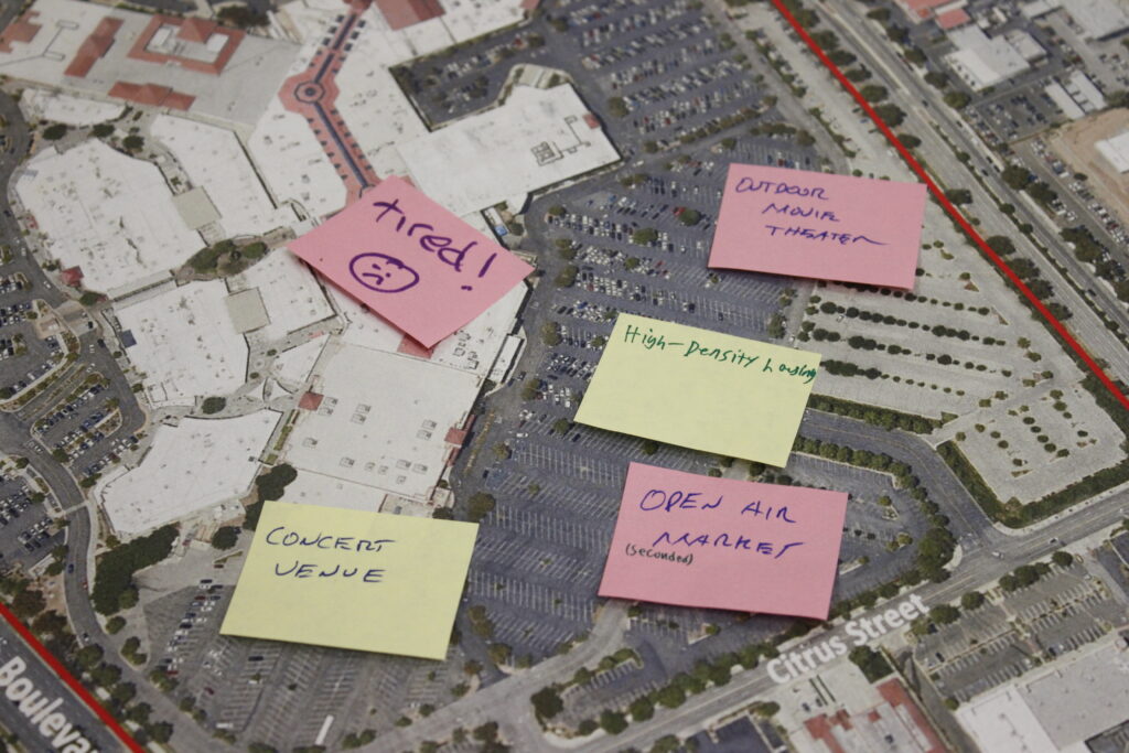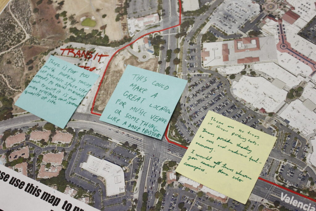 A map of the area under consideration, which spans the Town Center mall, the former SCV Sheriff’s Station, and the Santa Clarita Library and Courthouse, was placed in the center of the room with sticky notes where residents could write down suggestions.