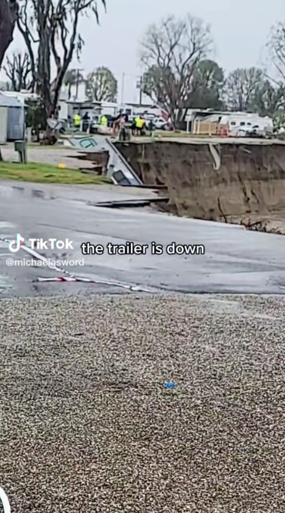 - Tik Tok user michaelasword shows the aftermath of the flood and a trailer hanging off the cliff.