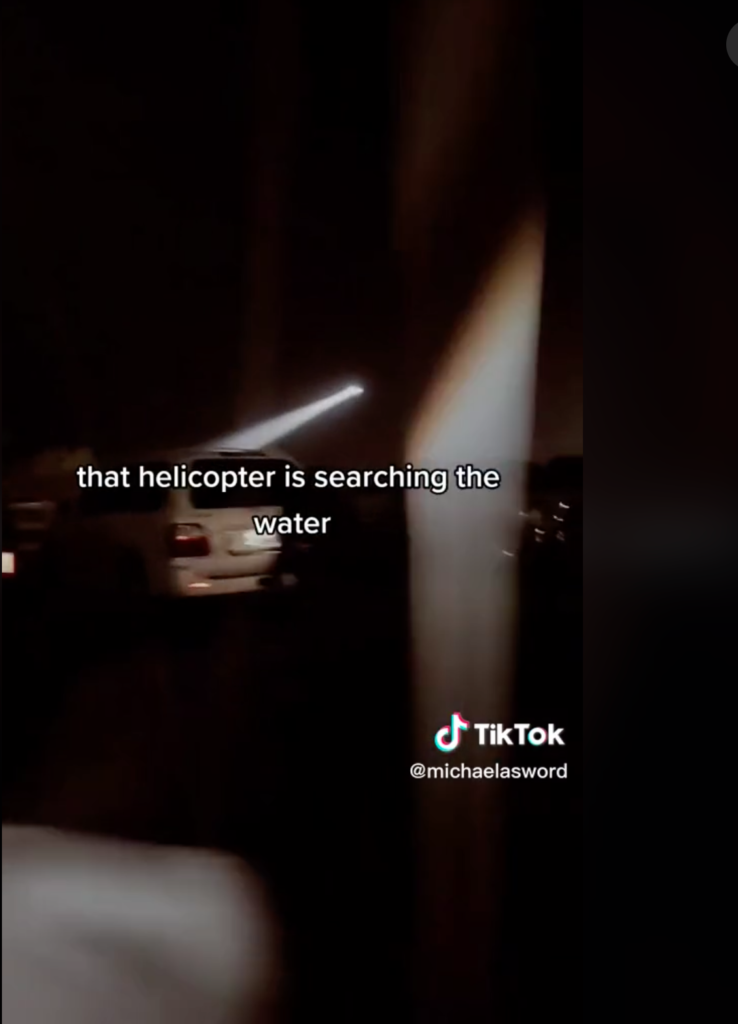 - The night’s events are recorded by Tik Toker michaelasword. A helicopter searches for possible people in the water.