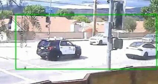 Security cameras captured the moment when two vehicles collided with a Santa Clarita Valley Sheriff’s Station vehicle at a Santa Clarita intersection.