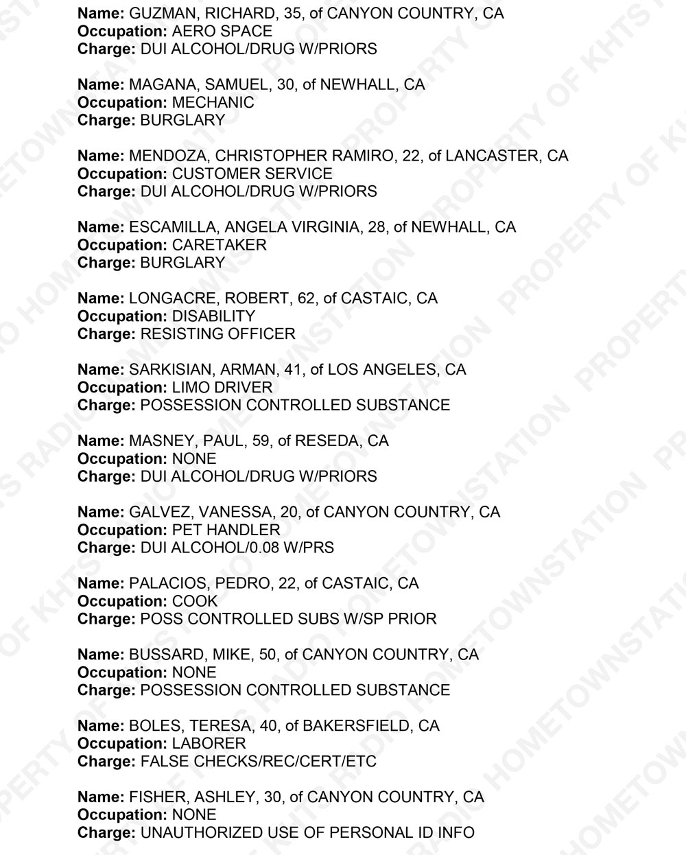 Santa Clarita Crime – Santa Clarita Valley Sheriff – Bookings for Saturday, December 16, 2017
