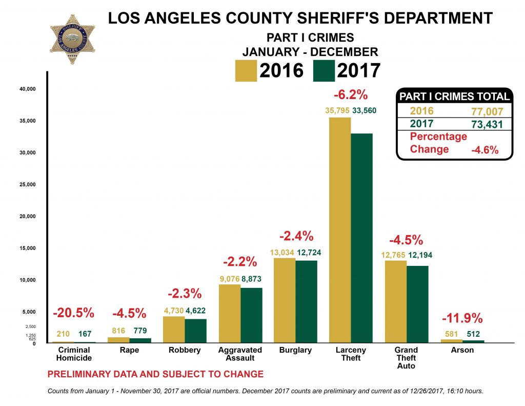 “Today, I’m pleased to report significant decreases in crime rates across L.A. County,” said Sheriff McDonnell, in reference to the compelling Part I crime drop. “This represents nearly 3,600 fewer violent crimes or property crimes committed this year.”