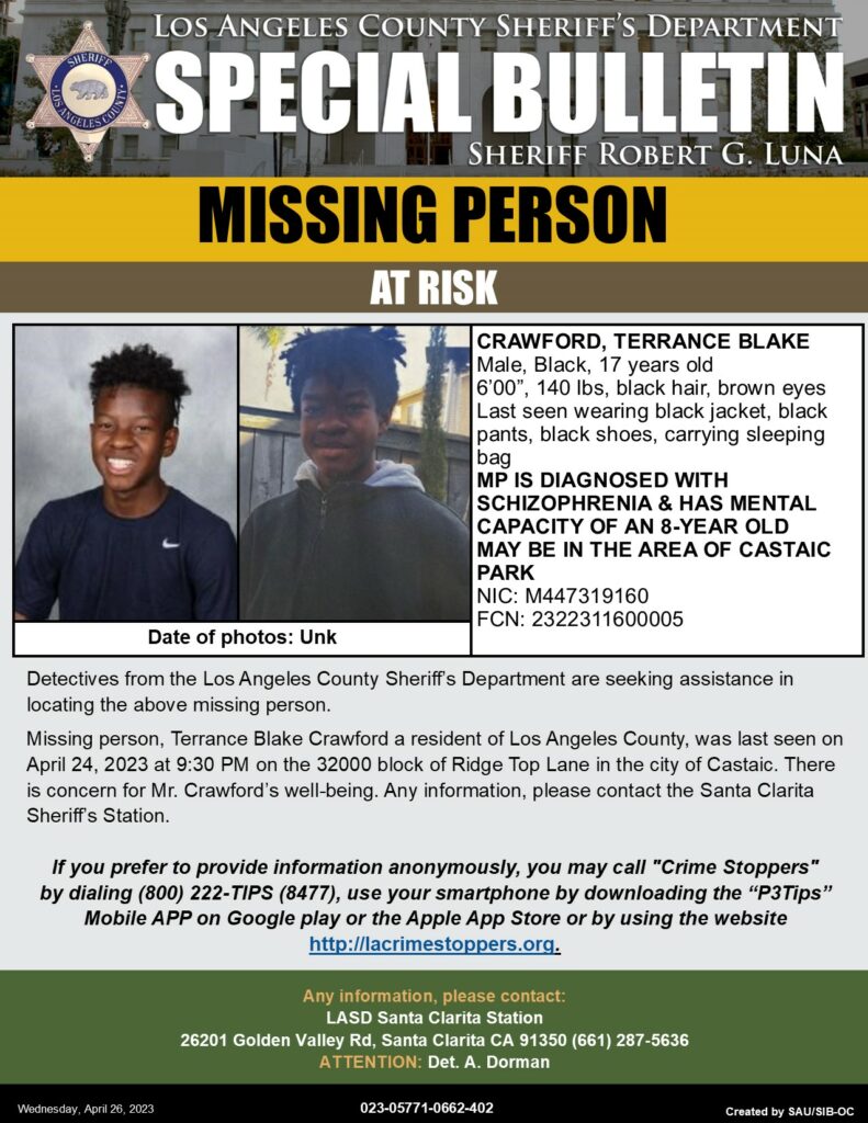 Blake Crawford is a 17-year-old male Black who was last seen on April 24, 2023 on the 32000 block of Ridge Top Lane in Castaic, according to officials.