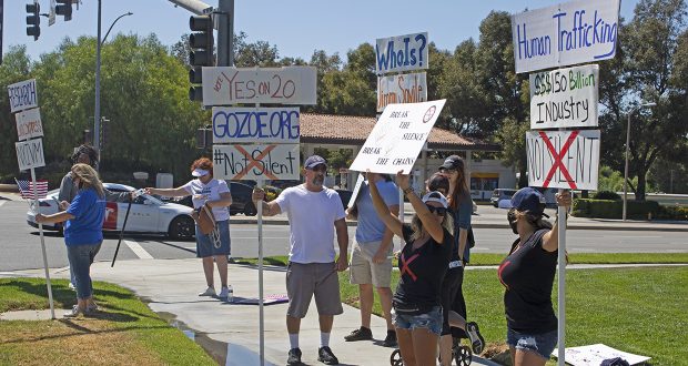 On Thursday, dozens of protesters lined the sidewalks around the intersection of Valencia Parkway and McBean Parkway in Valencia to protest human trafficking.