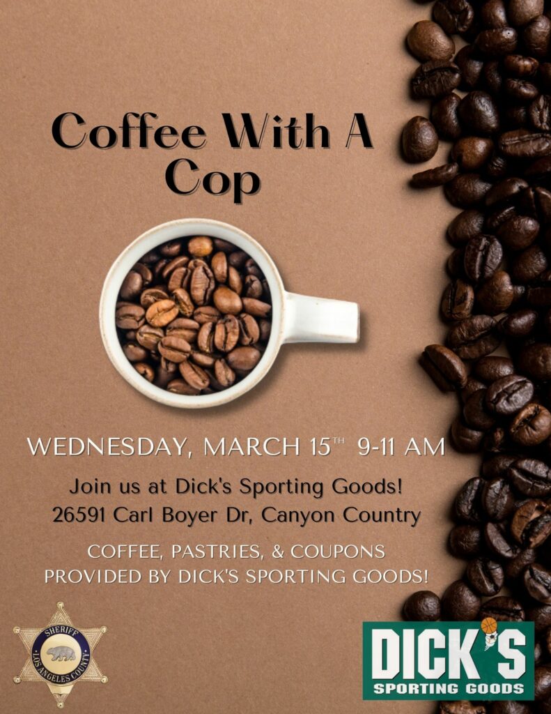 “We’d love to meet with you and talk over coffee. Ask us questions, share your concerns and get to know your zone deputies. Hope to see you there,” said Deputy Natalie Arriaga, spokesperson for the Santa Clarita Valley Station.