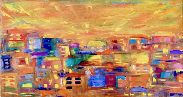 Naomi was born and raised in Jerusalem, Israel and left it 40 years ago, but her love for the city has never diminished. Her home town’s majestic beauty is the source of her inspiration. She pours her yearnings for her beloved city through her paintings, mosaics and books of poetry. She shares, “I may have left the city of Jerusalem, but it has never left me.” Through the use of vivid, brilliant colors, she expresses her love for the ancient city of Jerusalem and its eternal beauty.