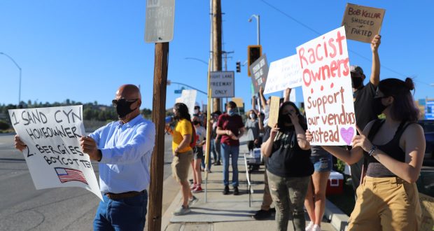 Over 50 protestors gathered at the intersection of Soledad Canyon Road and Sand Canyon Saturday, the location of a recent viral video to boycott a local business.
