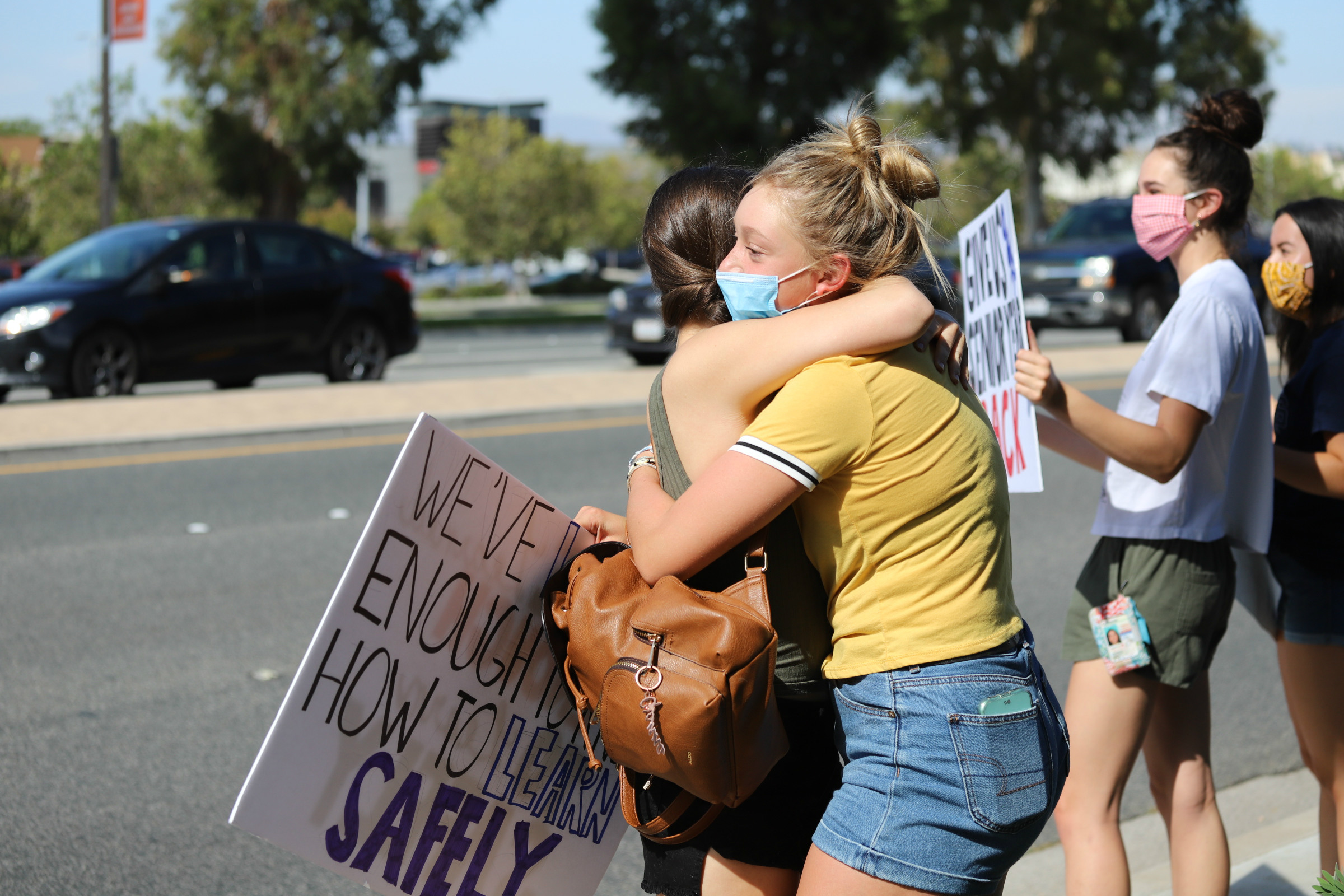 “We’re standing in solidarity with our students, as well as some our teachers and faculty and staff members who believe that they would like to get back to in-person instruction in the classroom at our local schools, utilizing all the PPE (personal protective equipment) and safety protocols that have been designated as necessary by the L.A. County Health Department,” said Greg Wolf, who helped organize the rally.