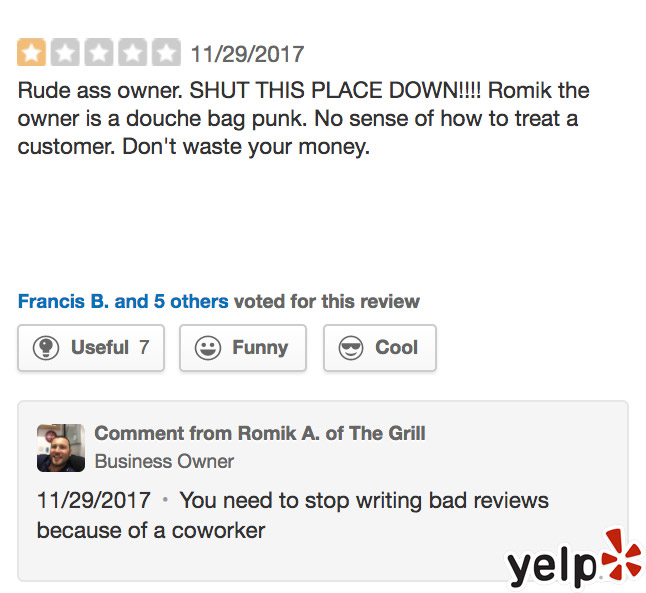 But Rolle said he does not believe the defense made by The Grill restaurant owner, confirming that the person in the picture on the Yelp profile is the same person who he spoke with at the restaurant.