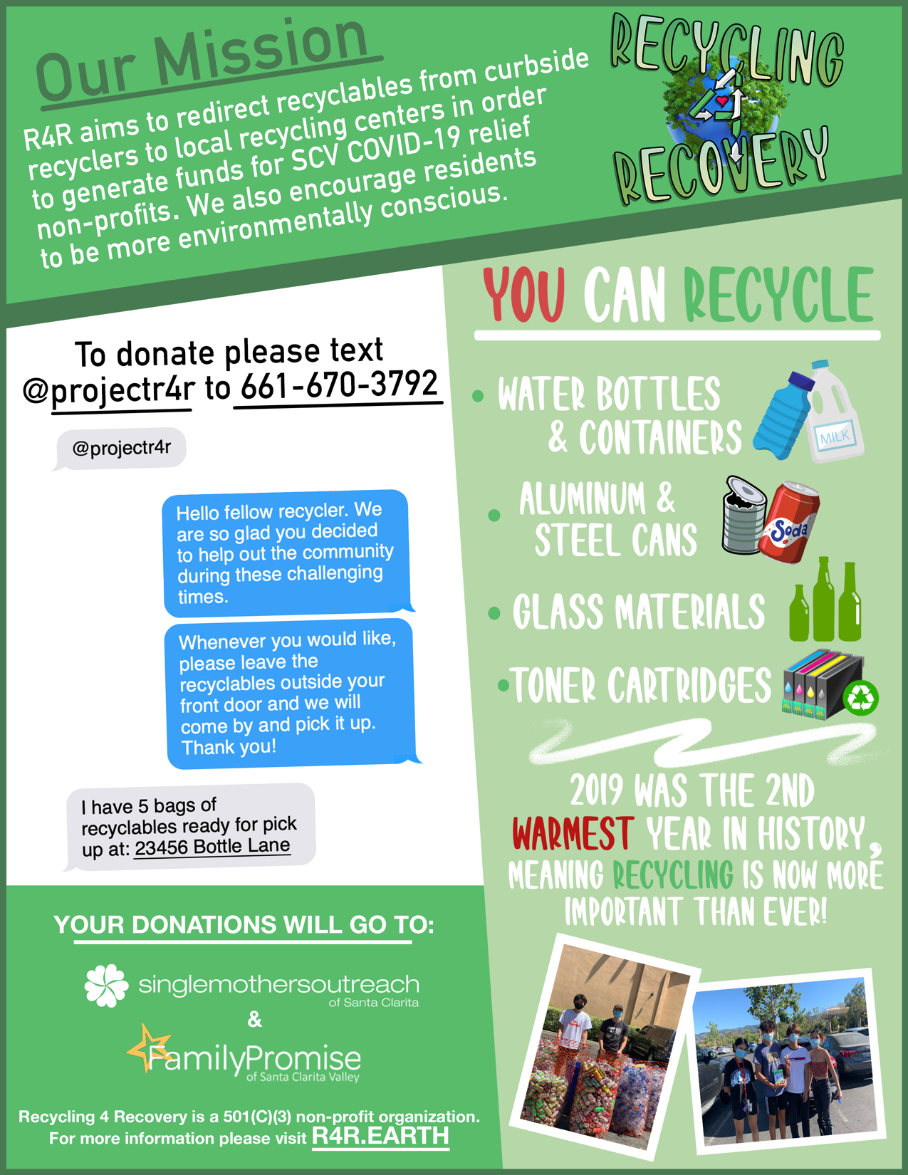 Two West Ranch High School students are collecting recyclables and donating all the income to two Santa Clarita non-profits to help those in need during the coronavirus pandemic.