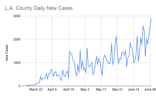 Bars and breweries that do not serve food continue to remain closed once again as 2,903 new cases reported across Los Angeles County Monday afternoon — the largest number of COVID-19 cases in one day, officials said.