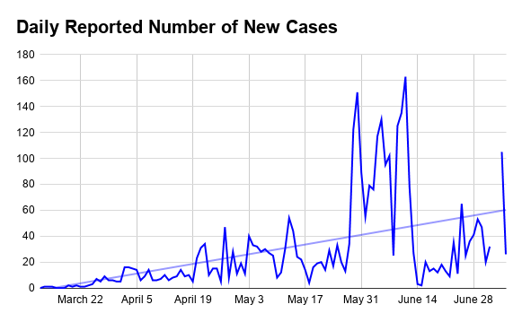 Note: No Santa Clarita specific coronavirus case increases were available for July 3-4, 2020. A total of 105 cases were reported for the weekend on Sunday, July 5.