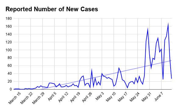 *As of Friday, June 12, officials had recorded 1,307 cumulative cases among prisoners at the North County Correctional Facility, and 485 at the Peter J. Pitchess Detention Center. Those cases are counted in both the Santa Clarita and Castaic totals.