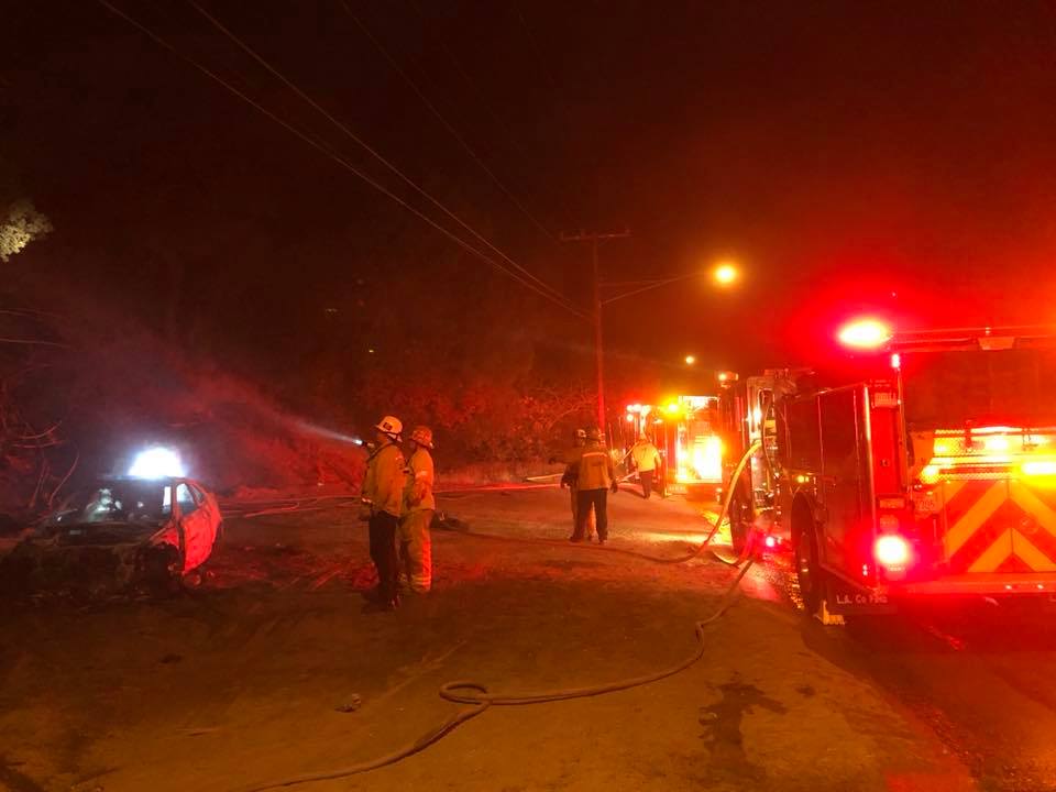 At about 8:00 p.m., CHP responded to a responded to a fully engulfed vehicle that spread to a quarter acre brush fire near the Oak Tree Gun Club in Newhall, according to fire officials.