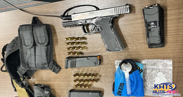 A photo posted by the Santa Clarita Valley Sheriff’s Station Twitter account shows an array of weapons and illegal substances, including a firearm with two magazines and a taser.