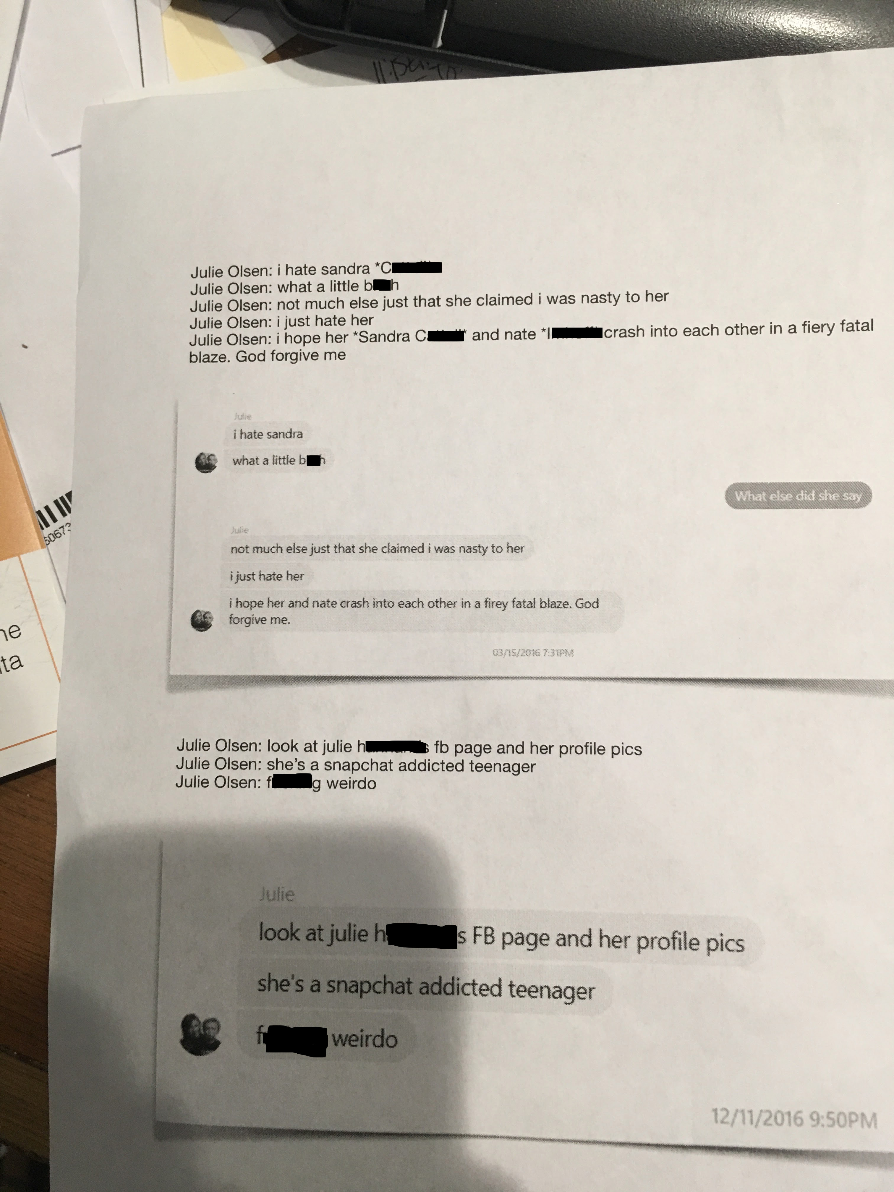 Some of the texts from Julie Olsen that were provided to KHTS anonymously. They show her using crass language to describe members of the community.