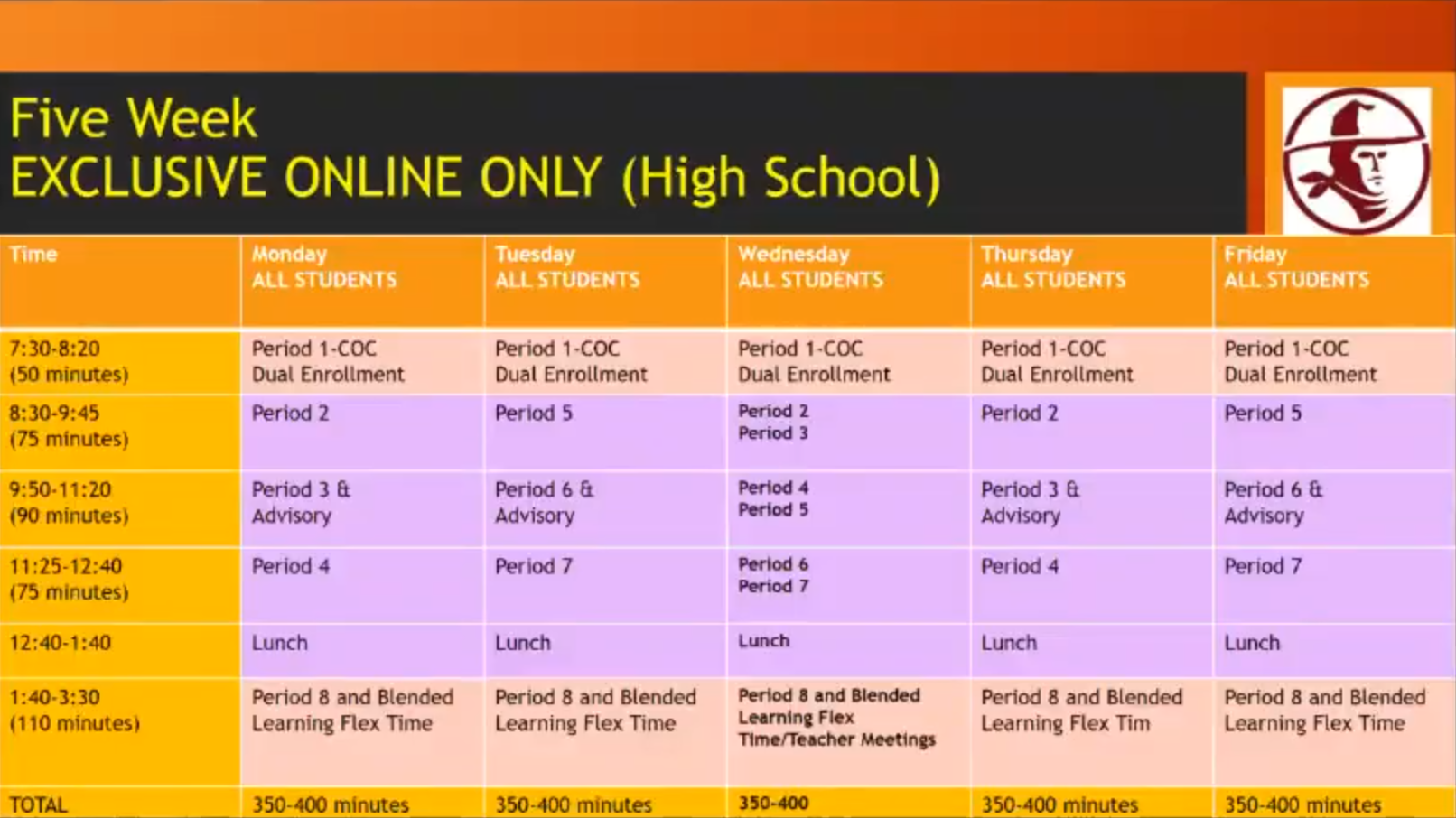Every day of physical attendance would be a block schedule of three classes, and every weekday that was not spent physically in a classroom would be used for distance learning.