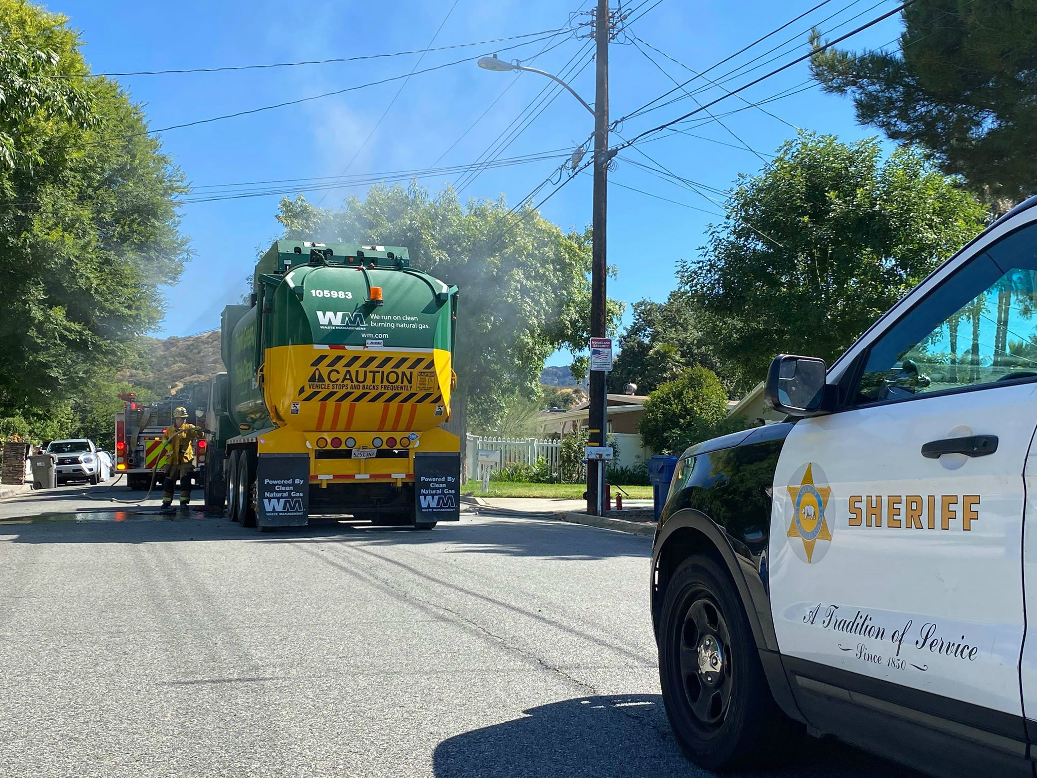 A garbage truck caught fire in Newhall on Friday afternoon, prompting a response from the Los Angeles County Fire Department.