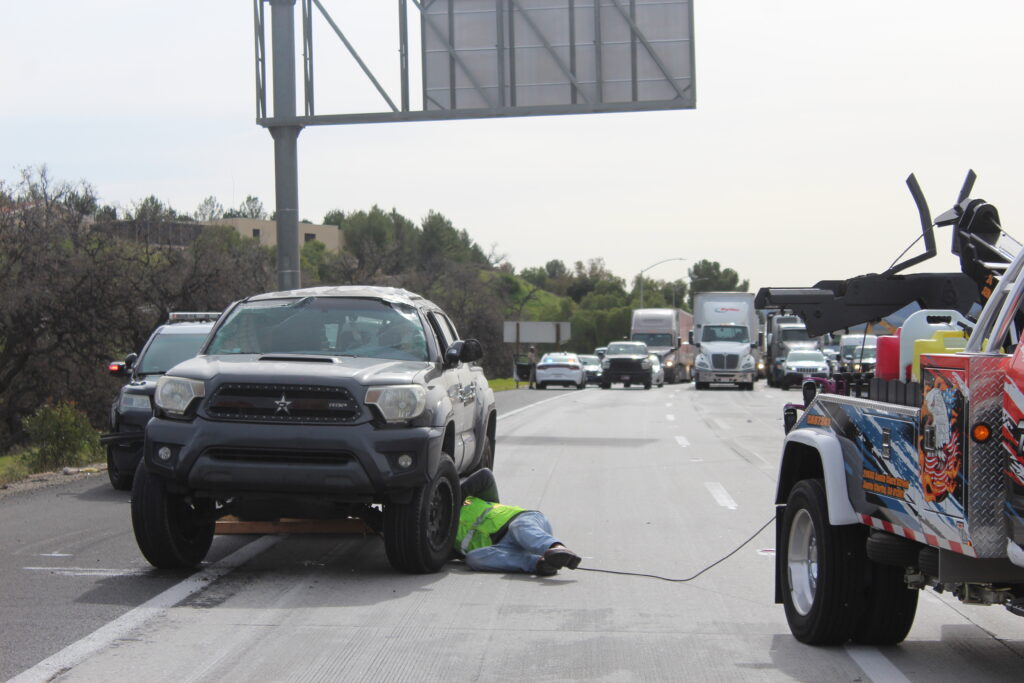 All lanes are blocked on the 5 Freeway as workers attach truck to tow truck. Photo by Linsey Towles