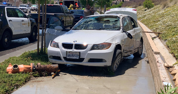After arriving on scene at 1:20 p.m., first responders found that a white BMW had crashed into a fire hydrant along Plum Canyon Rd.